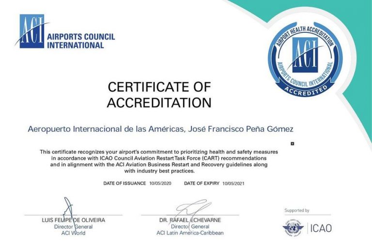 Aeropuertos Dominicanos Siglo XXI (Aerodom), recibió la Acreditación de Medidas Sanitarias que otorga el Consejo Internacional de Aeropuertos (ACI) para el Aeropuerto Internacional de Las Américas (AILA), que sirve a la ciudad capital de Santo Domingo.