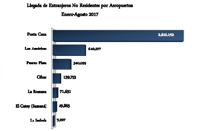 El Aeropuerto Internacional de Punta Cana sigue liderando el flujo de pasajeros en la República Dominicana, teniendo en cuenta que sirve a los turistas de la principal zona turística del país y en ese sentido el Banco Central de la República Dominicana (BCRD) indica que la llegada de extranjeros no residentes al país durante el período enero-agosto de 2017, según aeropuertos, muestra que la terminal de Punta Cana recibió por sus instalaciones el 67.7% de los turistas extranjeros, es decir 2,616,152 pasajeros.