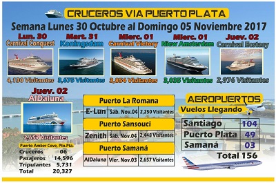 En la información suministrada por Julio Almonte, vice ministro de Turismo para la costa norte del país, se detalla que Puerto Plata estará recibiendo 06 buques de cruceros con 20,327 visitantes, de estos, 14, 596 son pasajeros y 5,731 son tripulantes.