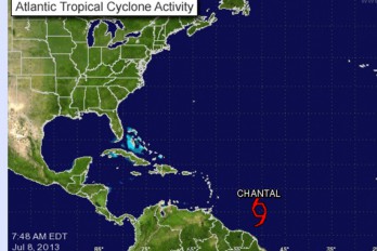 La tormenta Chantal fue localizada en la madrugada de hoy cerca de la Latitud 10.4º Norte y Longitud 49.5º Oeste a unos 1130 kilómetros al Este/sureste de Barbados, Antillas Menores y se mueve rápidamente hacia el Oeste a unos 43 kph y se espera un giro hacia Oeste/noroeste en los próximos días. Sus vientos máximos sostenidos son estimados cerca de 65 kph, con ráfagas superiores.